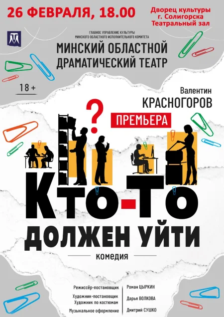 Спектакль "Кто-то должен уйти" - бытовая комедия. Дружный коллектив с ужасом узнает, что один из сотрудников должен быть уволен. Среди сотрудников начинается отчаянная борьба за выживание, за свои места и должности. В ход идут самые разнообразные средства и приемы. Спектакль о том, как индивидуум ведет себя в стрессовой ситуации, насколько ему удается оставаться человеком.
