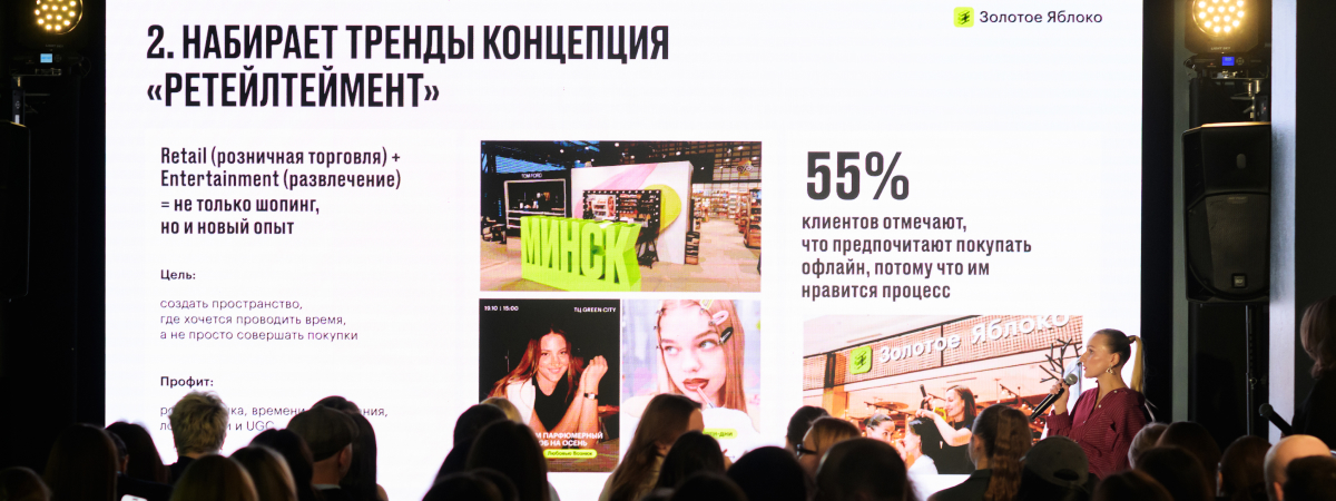 Это подтверждается выводами собственного исследования «Золотого Яблока»: 11% клиентов выбирают магазин из-за атмосферы в нем. Крупные игроки индустрии отвечают на этот запрос концепцией «ретелтеймент» (от англ. retail — розничная торговля, entertainment — развлечения). Суть концепции в том, чтобы предложить клиенту не просто шопинг, а интересное времяпрепровождение, новый опыт. «Золотое Яблоко» — один из первопроходцев этого подхода в СНГ — регулярно проводит в своих магазинах бьюти-уроки, встречи с экспертами, мастер-классы по кастомизации аксессуаров и другие активности, которые интересны клиентам.