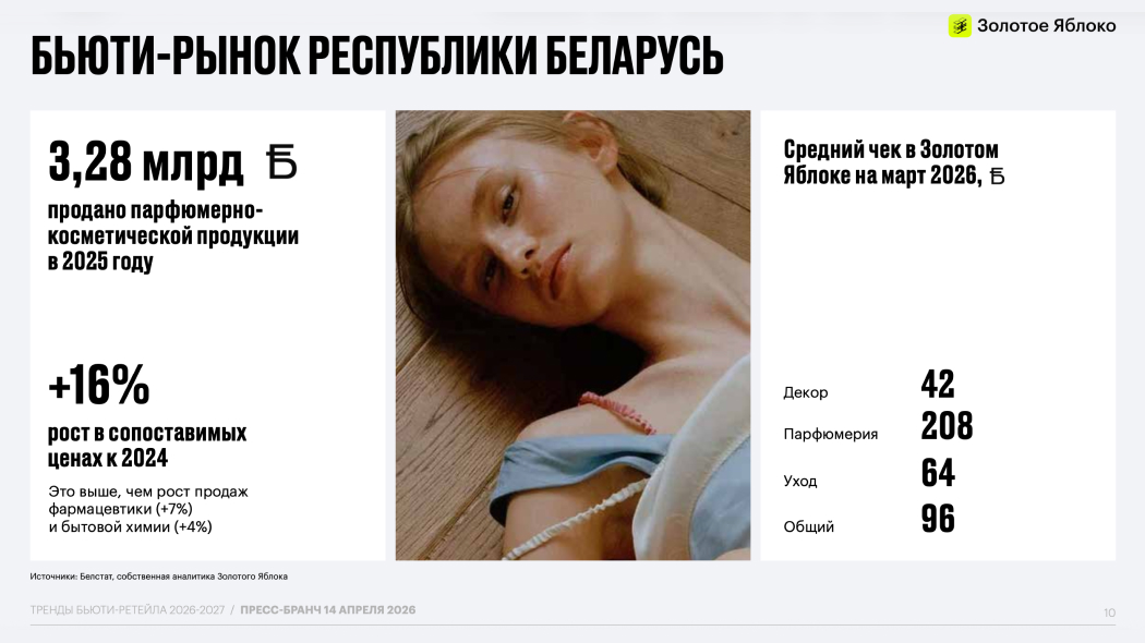 «Золотое Яблоко» подсчитало, сколько клиенты в Беларуси тратят на бьюти-продукцию в каналах ретейлера, — средний чек по основным категориям на 2026 год выглядит так: