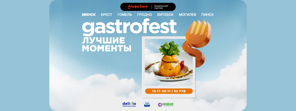 Генеральным партнером выступает Альфа Банк. По традиции гостей Гастрофеста будут ждать Альфа Бонусы, которые начислят каждому, кто оплатит сет картами Пакетов решений Альфы. Как их использовать? Потратить в ЕРИПе, покрыть ими часть стоимости банковских услуг, потратить на благотворительность или перевести в деньги. С картой Альфы не только вкусно, но и выгодно!