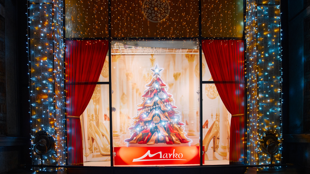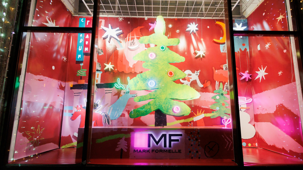 Одну из самых ярких витрин оформил Mark Formelle. В ее основу легла иллюстрация, созданная известным художником-примитивистом Ильей Кутобоем специально для модного бренда. В витрине можно увидеть новогодний пейзаж и персонажей – Деда Мороза, елку и лошадь – символ 2026 года. Ключевая идея работы – в погружении в мир ярких красок, теплых оттенков и смелых форм.