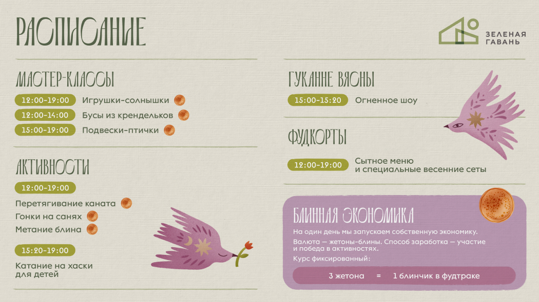 Взрослым предложат поучаствовать в «блинной экономике». Правила простые: участники получают жетоны за активность. Один жетон можно заработать за гонки на санках, перетягивание каната, освоение мастер-классов, метание блинов или публикацию сторис либо поста в Instagram с отметкой аккаунта Зеленой гавани. Накопив три жетона, их можно обменять на бесплатный блинчик.