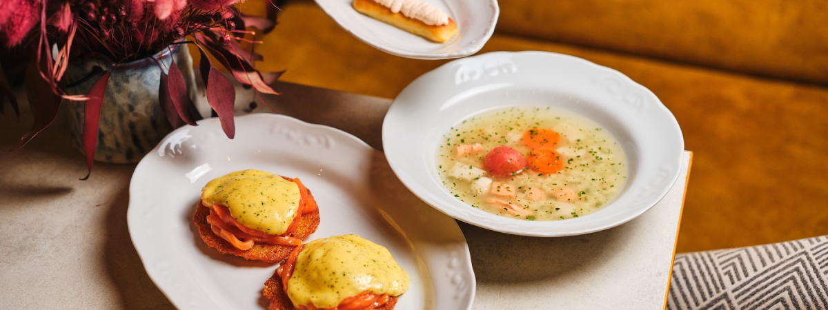- «Утро в Бургундии» (бриошь с ломтиком мортаделлы, подушкой из шпината и яйцом пашот, бархатный соус голландез с красной икрой)