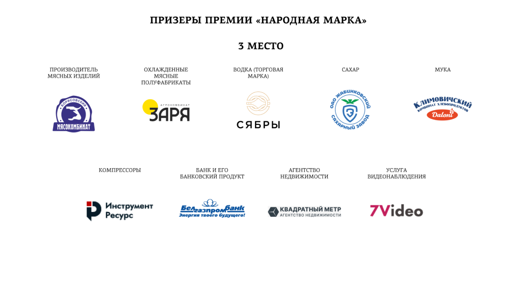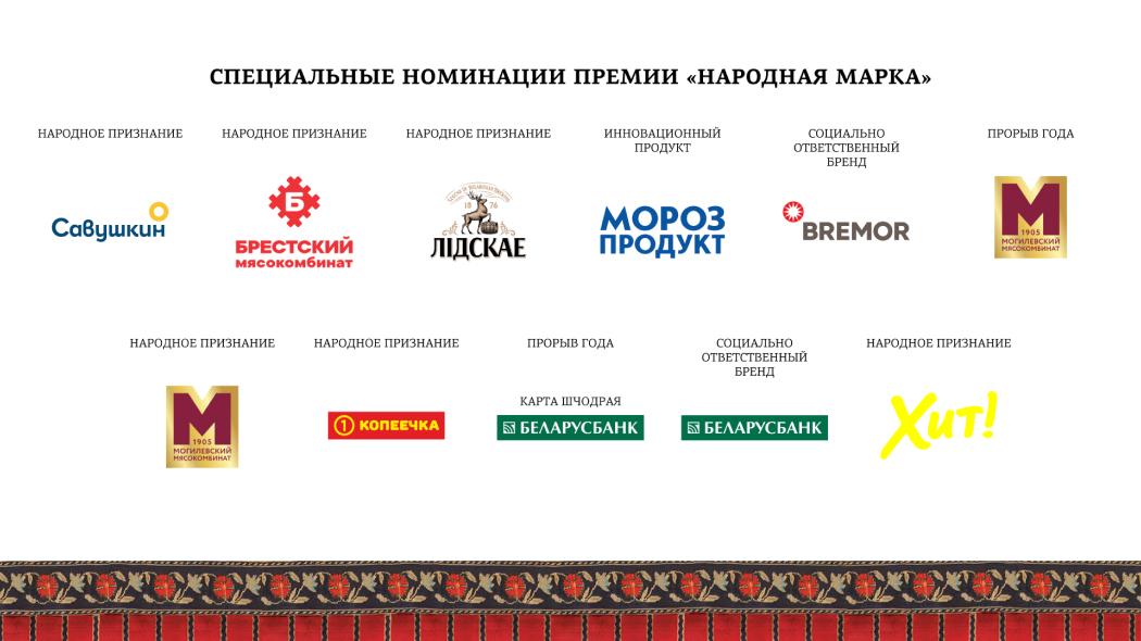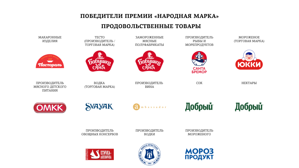 Пятого декабря в Минске состоялась торжественная Церемония награждения победителей ежегодной Премии потребительского признания «Народная Марка», определяющей бренды-лидеры потребительских предпочтений по широкому перечню товаров и услуг массового спроса. В течение многих лет награды и символика Премии являются узнаваемыми и престижными символами народной любви и доверия к производителям.