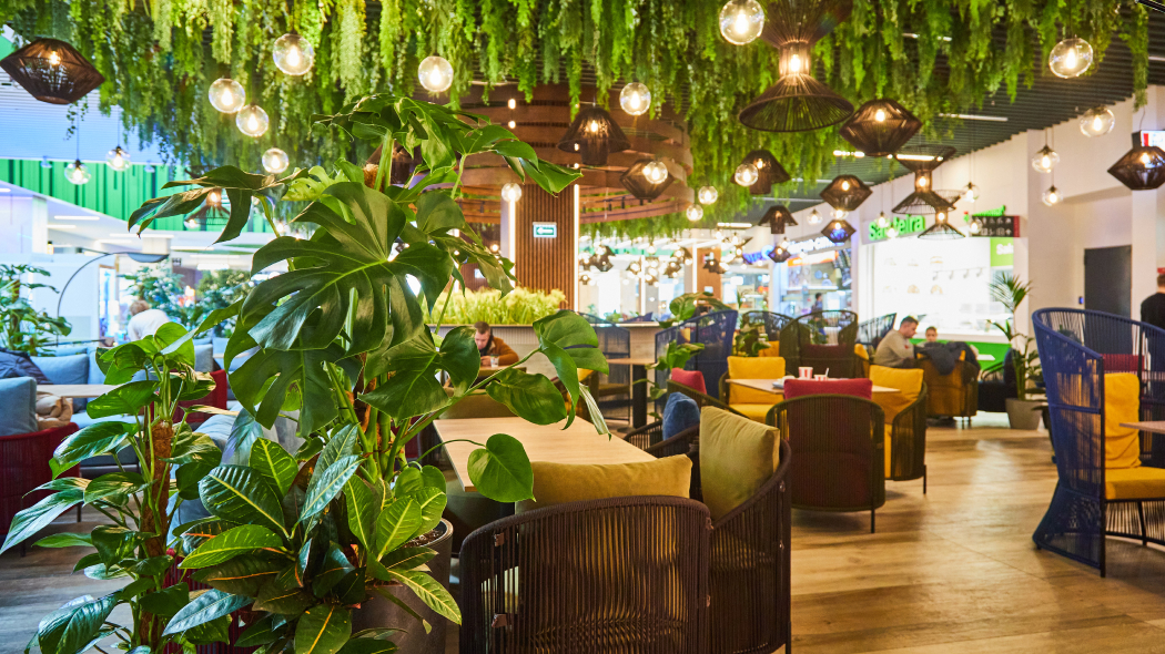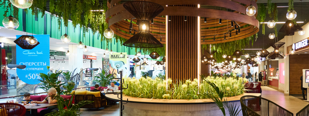 В фудхолл вложили около миллиона долларов. На площади в 1700 «квадратов» разместили ресторанные столики, глубокие диваны и удобные кресла. Под потолком «парят» 286 «солнц» – сферических светильников с атмосферной подсветкой. А над головой – целый «лес» из искусственной зелени.