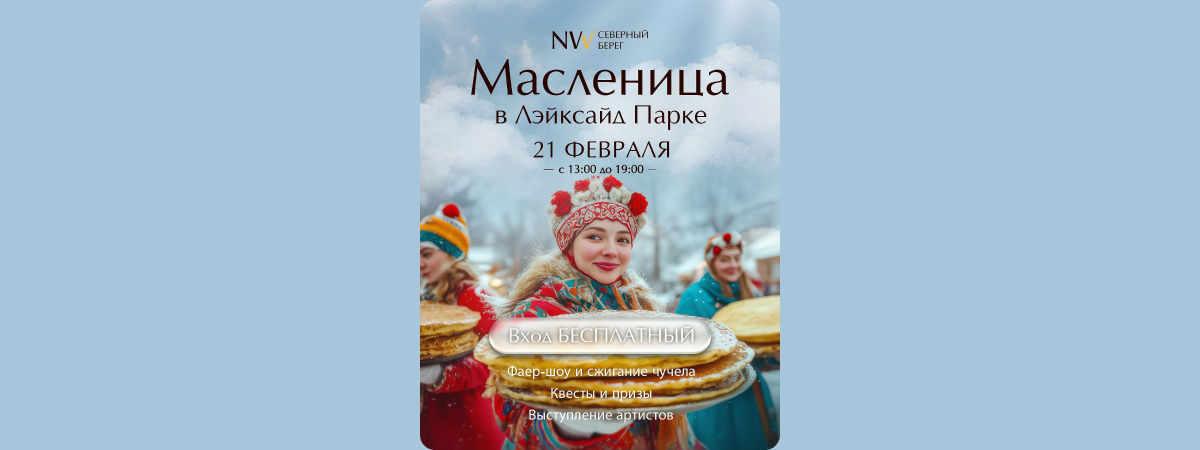 21 февраля в Лейксайд Парке жилого комплекса «Северный Берег» пройдёт масштабная Масленица — шумные и яркие проводы зимы для всей семьи. С 13:00 до 19:00 пройдет насыщенная программа, конкурсы, квест по парку и выступления творческих коллективов.