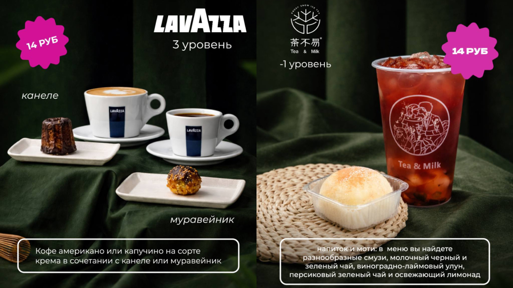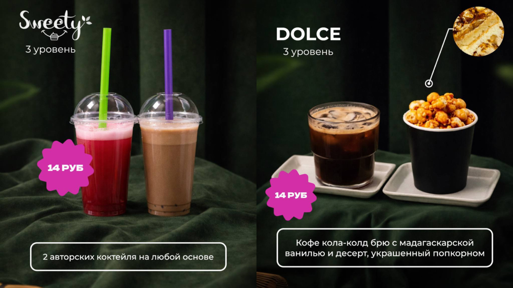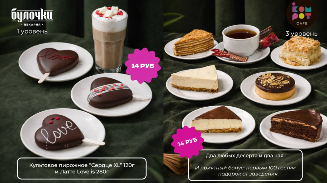 Сеты разделены по стилю. Над «классикой» поработали в Lavazza – капучино и американо «мэтчатся» с канеле и муравейником. В «Булочках» латте дополняют сердечные пирожные. В Dolce подают кофе кола-колд брю с десертом в виде попкорна. А в кафе «Компот» предлагают выбрать два любых десерта и чая.