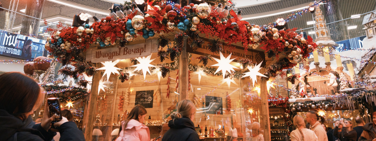 В Dana Mall вновь засияла новогодняя инсталляция. В этом году здесь раскинулся рождественский рынок «Калядны кiрмаш». Это масштабная праздничная инсталляция, в которой оживают уютные торговые ларьки с новогодними украшениями, изделиями из соломы, сладостями и фонариками.