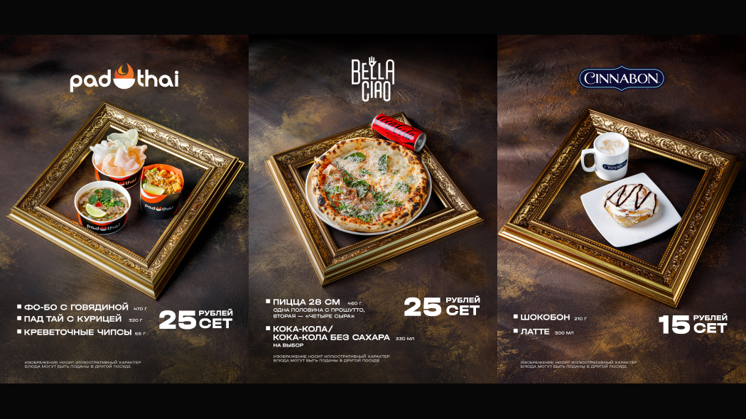 В меню фестиваля вошли сеты «Подсолнухи» Ван Гога, «Прима-балерина на сцене» Эдгара Дега и «Итальянский полдень» Карла Брюллова. Также представлены «Девятый вал» Ивана Айвазовского и «Над городом» Марка Шагала. Все сеты разные — от пасты и морепродуктов до бургеров и фо-бо. Стоимость сетов с горячими блюдами — 25 рублей, а с кофе и десертами — 15.