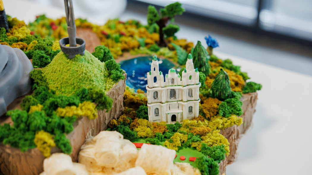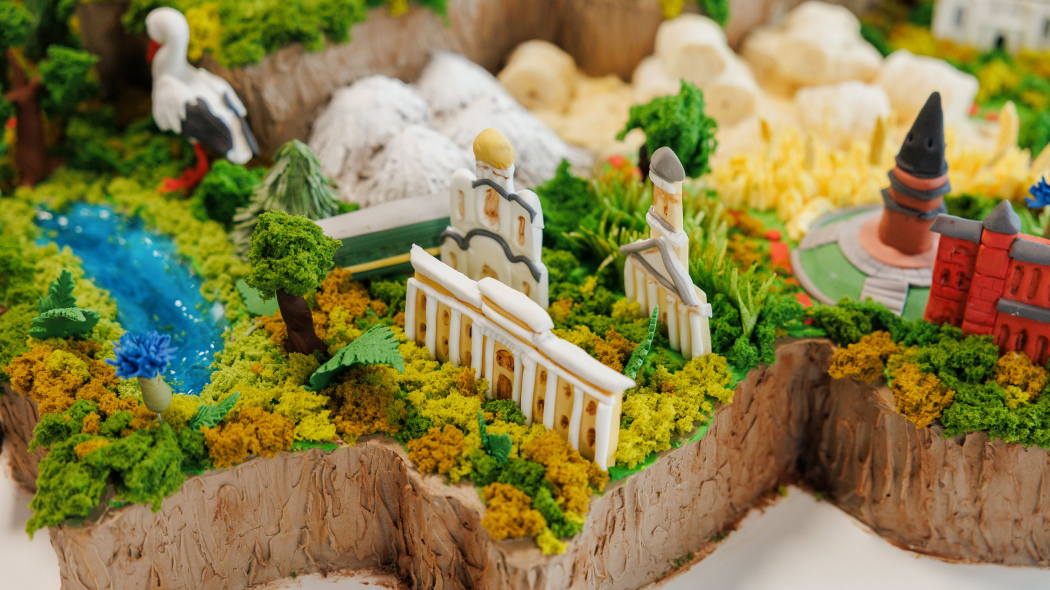 Декор торта выполнен вручную и воссоздает знаковые достопримечательности и символы каждого региона: от Национальной библиотеки и Брестской крепости до карьерных самосвалов, Беловежской пущи, аистов и зубров.