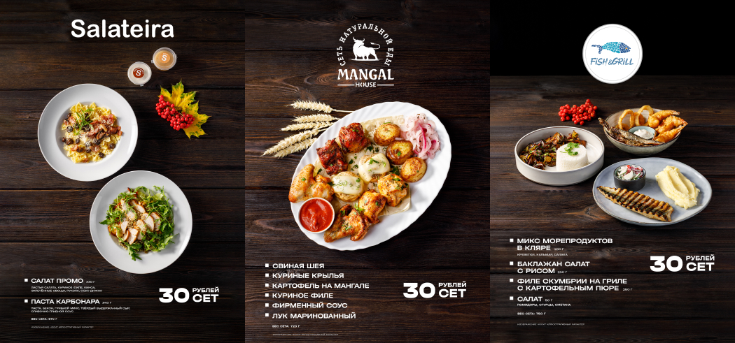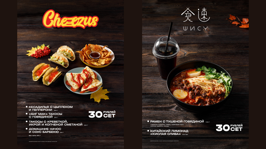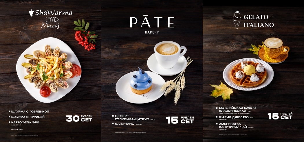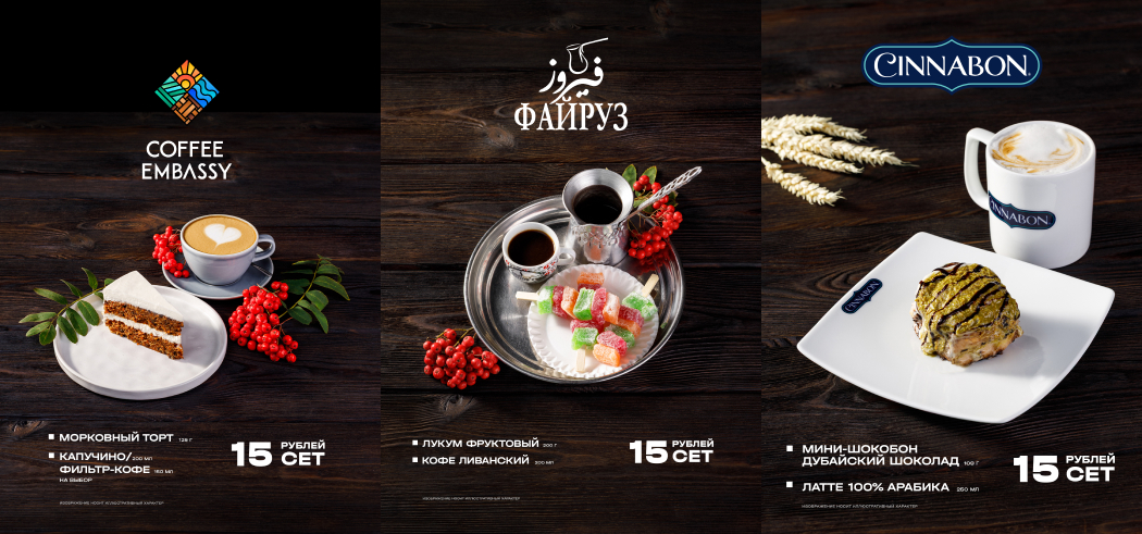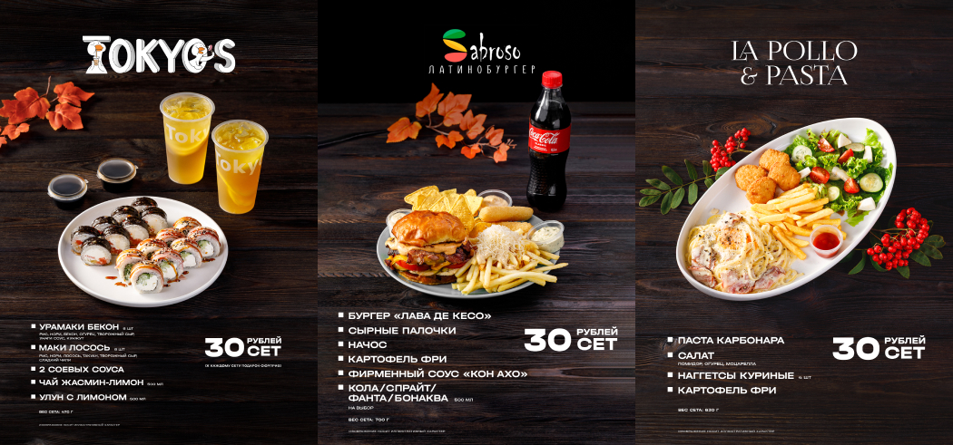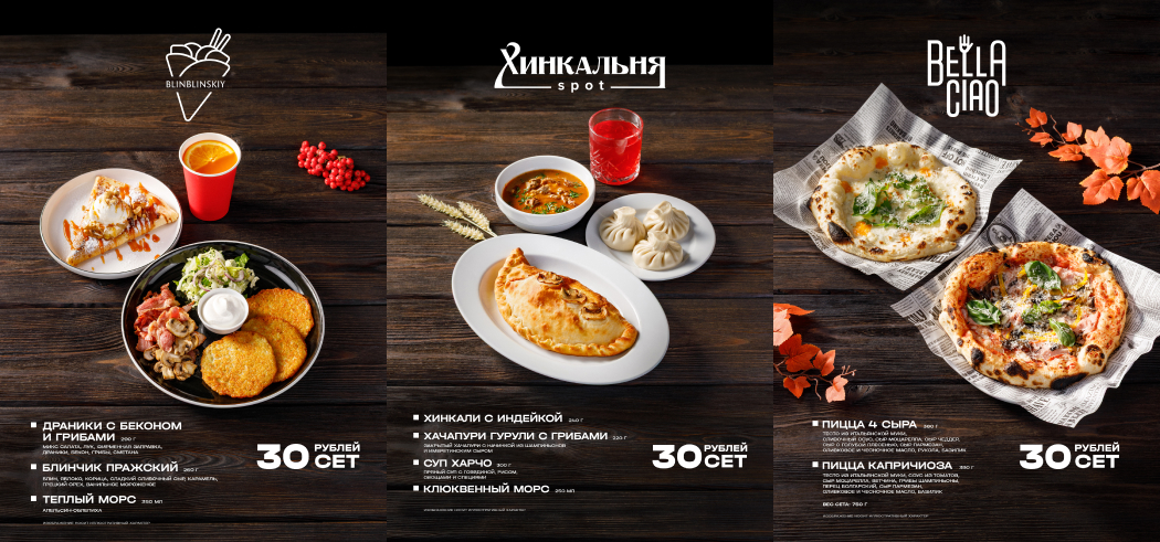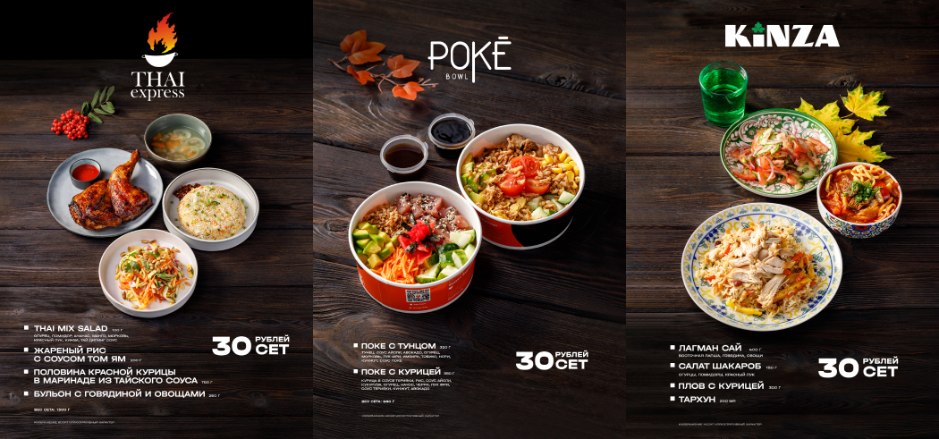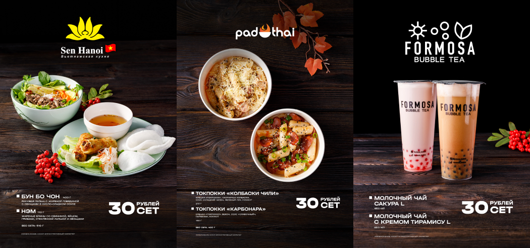 На фудмолле Конкорс будут представлены сеты от 24 ресторанов, среди которых Хинкальня, Шису, Pad Thai, La Pollo & Pasta, Kinza и другие.