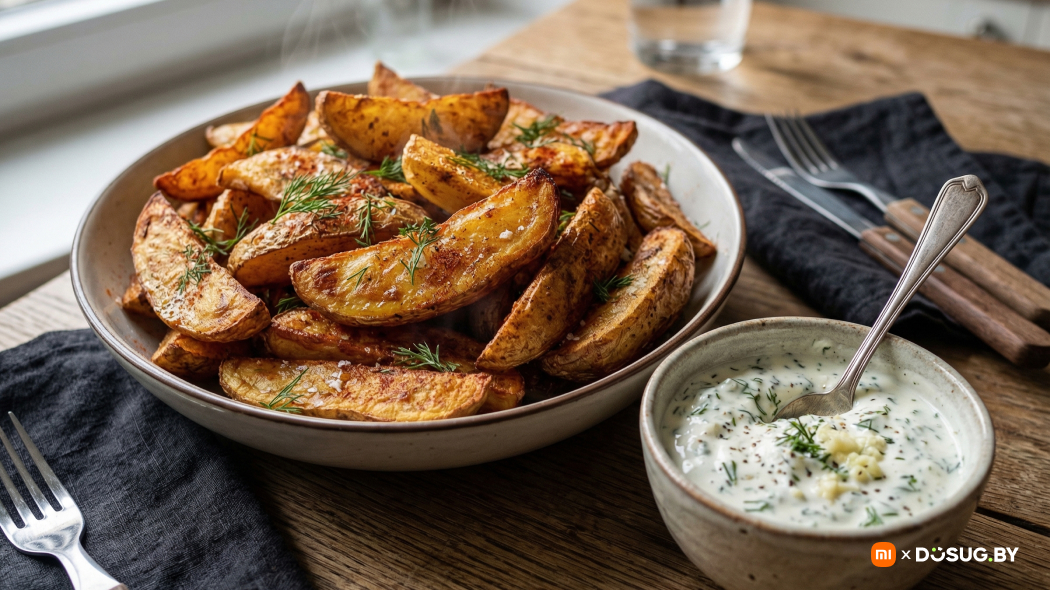 Используйте программу "Картофель фри" (200°C, 28 мин) с паузами для встряхивания каждые 10 мин — хрустящая корочка без лишнего жира. Соус: 150 г сметаны + 2 измельчённых зубчика чеснока + ½ ч. л. соли + свежий укроп, дайте настояться 10 мин. Сытный гарнир на 4 порции готов за полчаса.